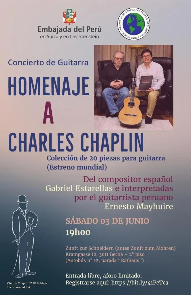 La Embajada de Perú en Suiza y el Círculo de Amigos de España, Portugal e Iberoamérica se complacen en invitar a nuestros miembros asociados al concierto “Colección de 20 piezas para guitarra en homenaje a Charles Chaplin”, del renombrado compositor español Gabriel Estarellas, ofrecida por el profesor de guitarra peruano de la Escuela de Música del Conversatorio de Berna Ernesto Mayhuire.